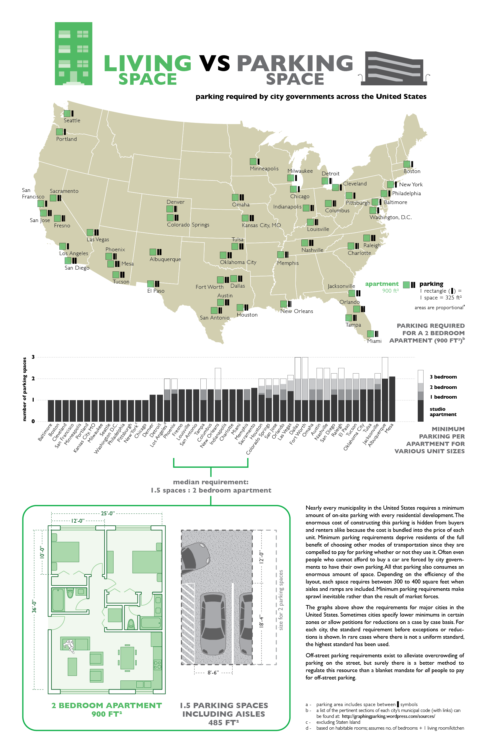Finally, the plans at the bottom of the infographic demonstrate just how big all that parking really is, while hinting at the opportunity cost of building it. Could the person sitting on the couch have afforded an additional bedroom or study if not for the parking? Maybe a balcony or garden space could have replaced the pavement…